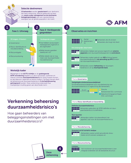 De Autoriteit Financiële Markten (AFM) heeft een verkenning gepubliceerd naar duurzaamheidsrisicomanagement door beheerders van Nederlandse beleggingsinstellingen. Dit naar aanleiding van wijzigingen per 1 augustus 2022 in de UCITS-richtlijn en in de gedelegeerde AIFM-verordening. Het onderzoek, uitgevoerd in twee fases, richt zich op de identificatie, beoordeling, minimalisering en monitoring van duurzaamheidsrisico's. De AFM heeft algemene observaties en specifieke inzichten geïdentificeerd op basis van de verzamelde gegevens.