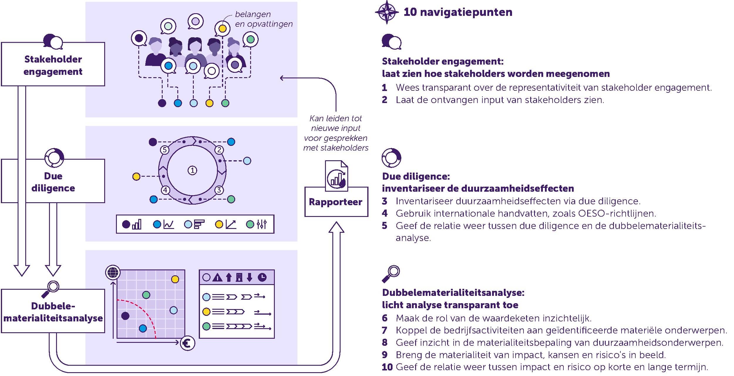 De infographic toont een circulair stroomschema dat gebruikers leidt van Stakeholder engagement, waar belangen en opvattingen worden opgehaald, naar Due dillegence, naar het uitwerken van de Dubbele materialiteitsanalyse tot Rapporteer, dat weer kan leiden tot nieuwe input voor gesprekken met stakeholders.