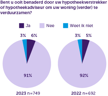 De meeste hypotheekbezitters in de Consumentenmonitor geven aan een woning met energielabel C te hebben. Hypotheekbezitters die verduurzaming overwogen maar er toch van afzagen noemen de materiaalkosten en een gebrek aan financiële middelen vaak als reden. De meerderheid van de respondenten is nog niet bekend met de diverse subsidie- en financieringsmogelijkheden. Van de hypotheekbezitters die hun woning niet verduurzaamden maar dit wel overwogen geeft ongeveer een derde aan de plannen nog steeds te hebben. Ongeveer 1 op de 20 hypotheekbezitters geeft aan in 2023 ooit door de hypotheekverstrekker of -adviseur te zijn benaderd om hun woning (verder) te verduurzamen. Dat is gelijk gebleven aan het onderzoek in 2022.