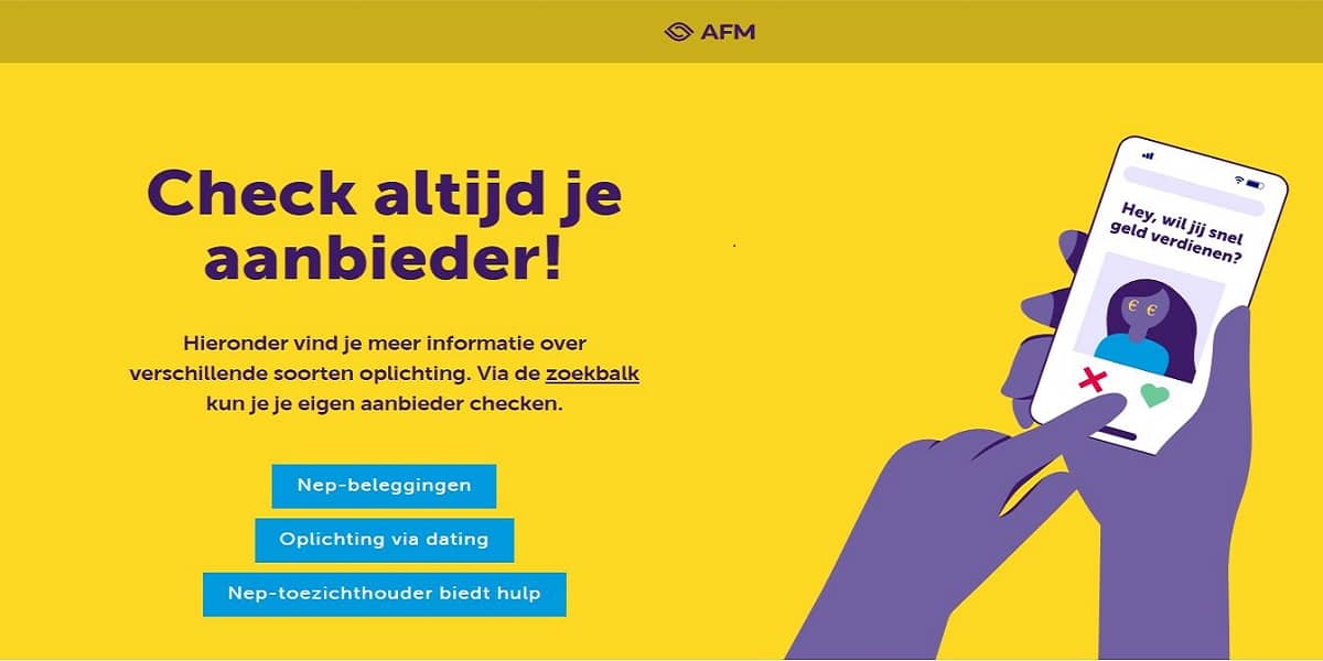 De Autoriteit Financiële Markten (AFM) ziet een toename in het aantal signalen en consumentenvragen over oplichting en fraude. De toezichthouder start daarom met de online publiekscampagne checkjeaanbieder.nl om mensen meer bewust te maken over hoe oplichters te werk gaan.