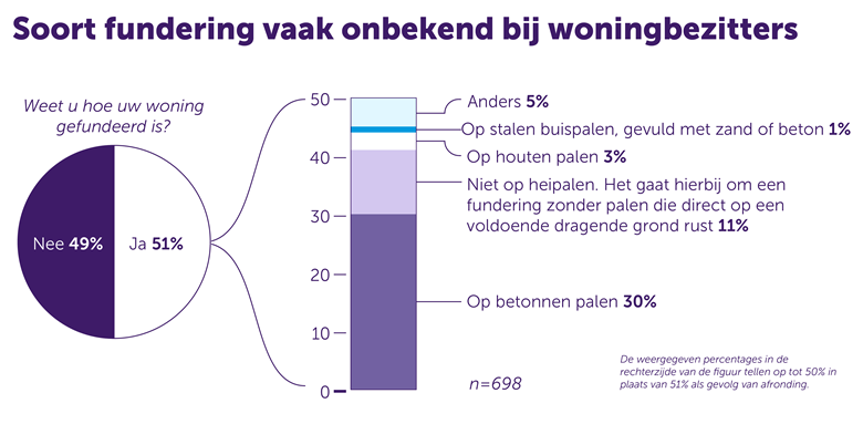 Uit de Consumentenmonitor Hypotheekbezitters blijkt nu dat acht op de tien huiseigenaren verwacht geen risico te lopen op funderingsproblemen. Ruim twee derde van de respondenten vindt de kans hierop te klein om zich daarover zorgen te maken. De helft van de hypotheekbezitters in de Consumentenmonitor weet echter niet op welke fundering hun woning staat. Van de hypotheekbezitters die zeggen dat wel te weten, geeft de meerderheid aan dat hun woning op betonnen palen is gebouwd. Een kleine groep (3%) geeft aan dat hun woning is gefundeerd op houten palen. Het is belangrijk dat (aankomend) woningeigenaren zich bewust zijn van de staat van hun fundering, zodat zij het risico op schade goed kunnen inschatten.