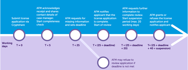 • De AFM voert eerste controle op volledigheid van de aanvraag uit. De wettelijke termijn voor het indienen van een volledige aanvraag gaat van start (25 werkdagen).